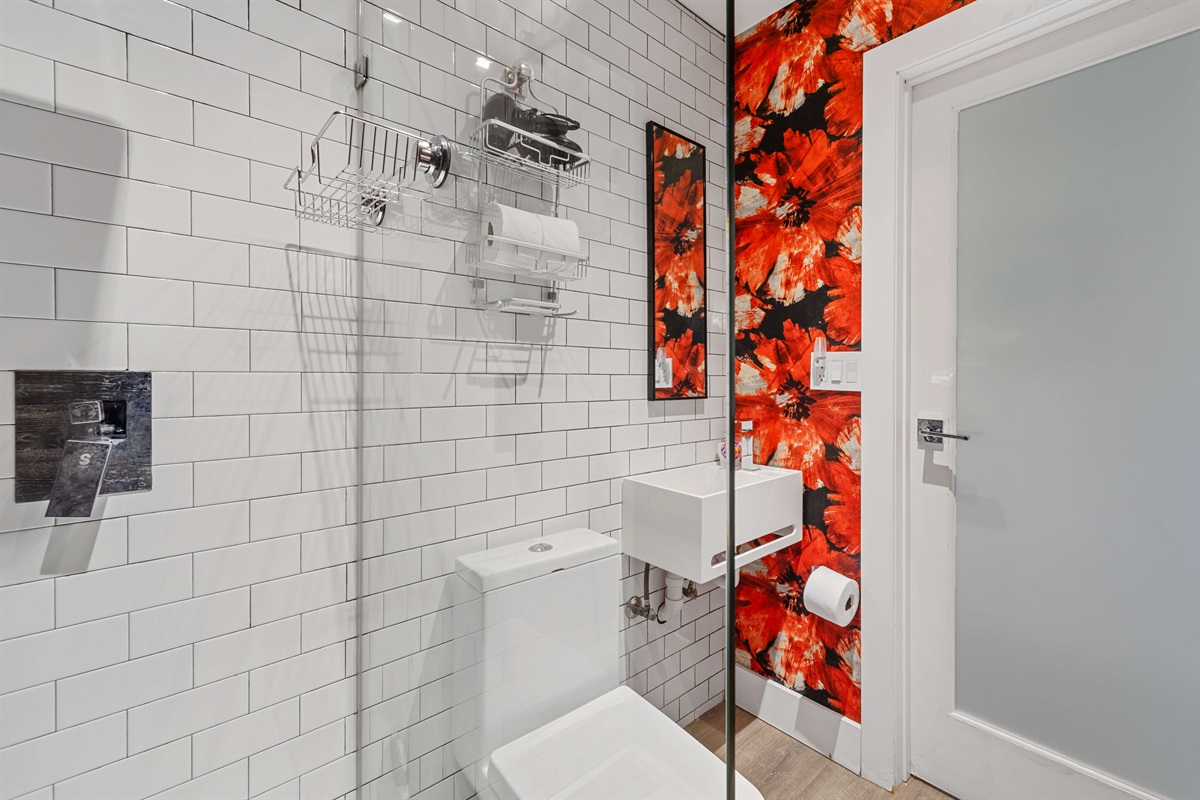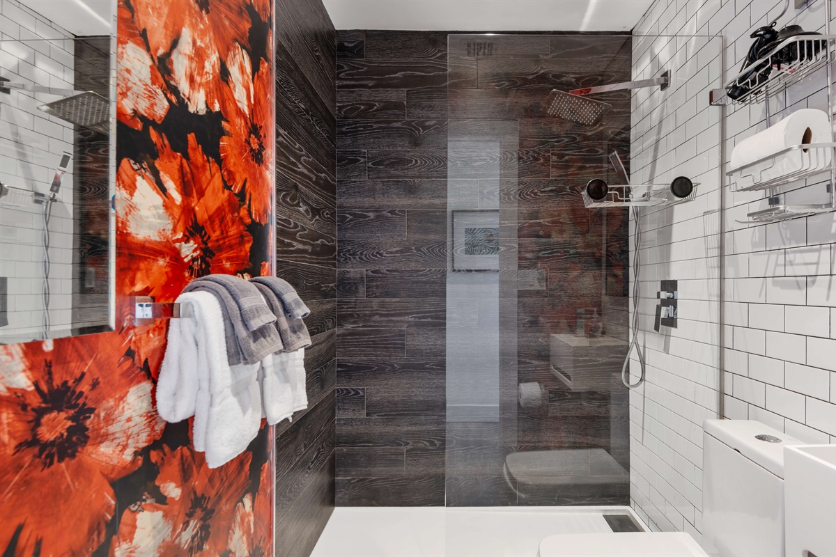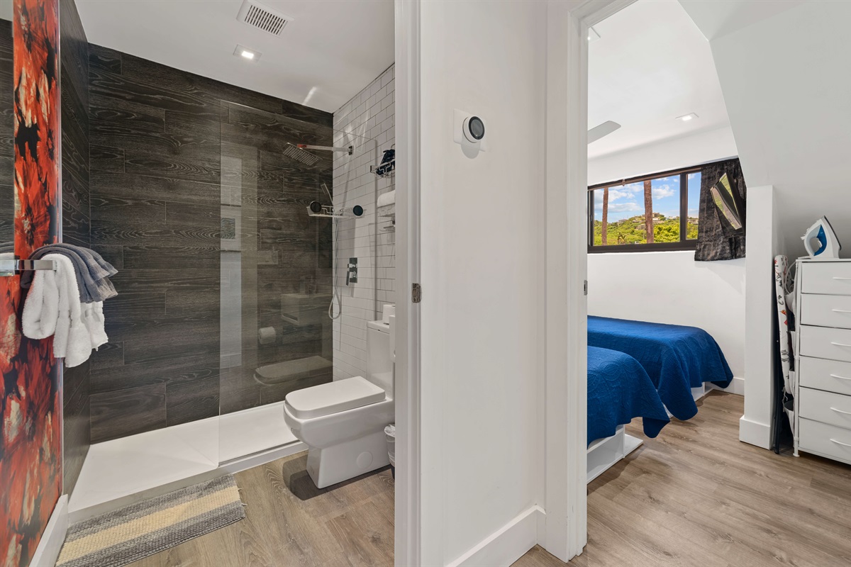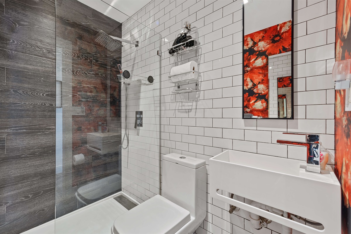 - Rain shower, toilet, vanity