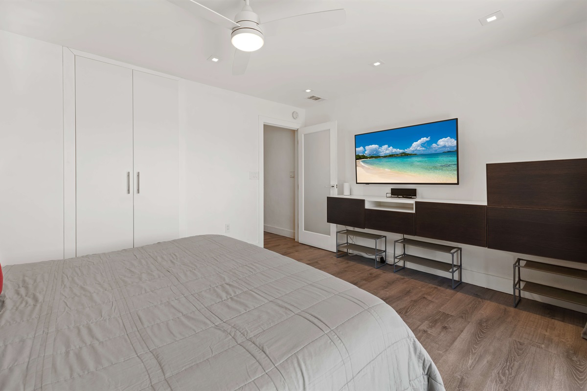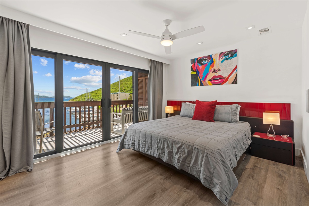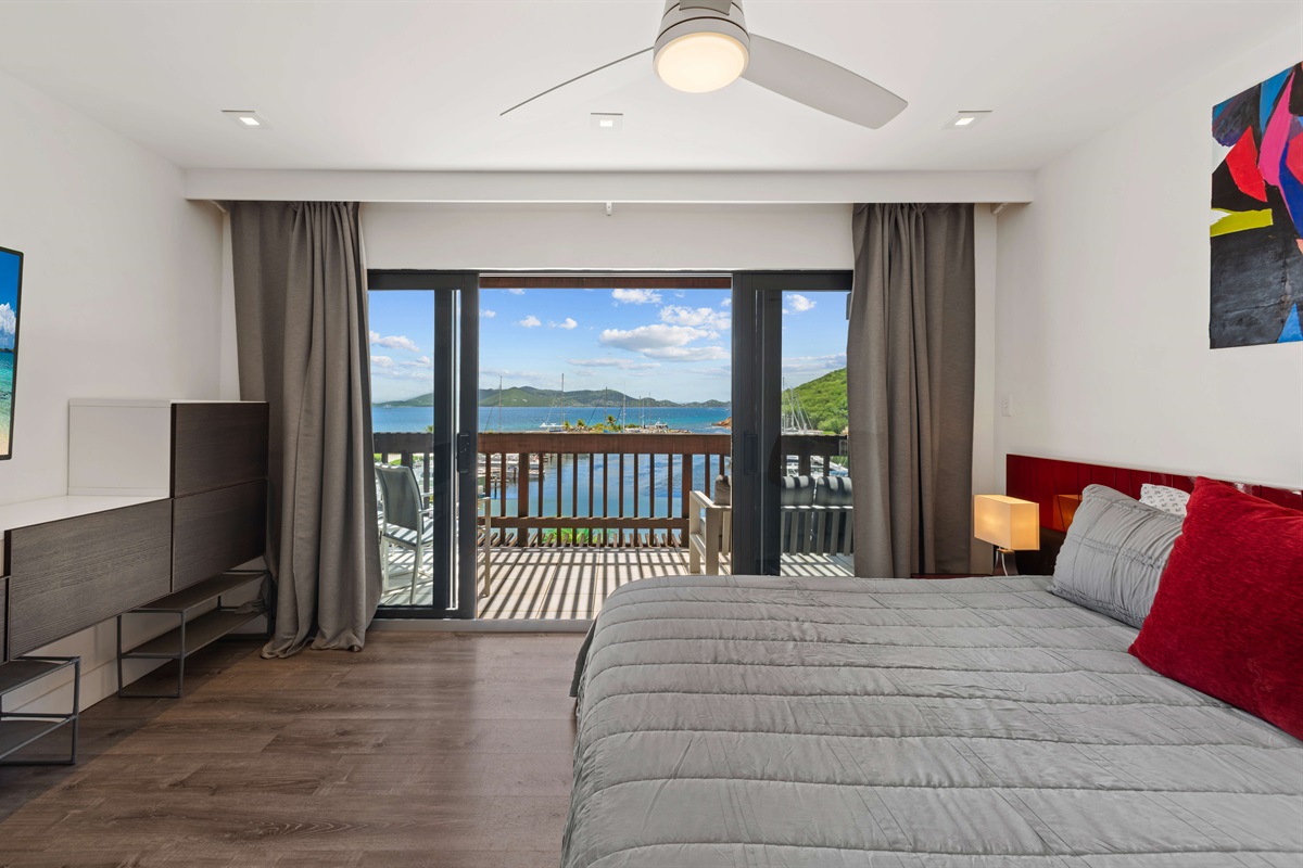 Bedroom 1 - Primary with king bed, ceiling fan, Smart TV, sliders leading to balcony with seating