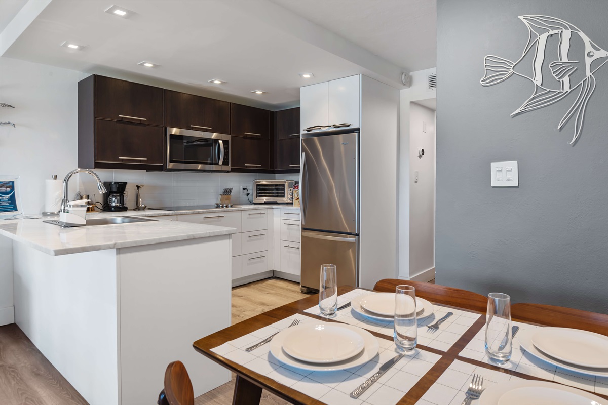 - Fully stocked kitchen with cooktop and microwave, dishwasher and countertop Breville oven